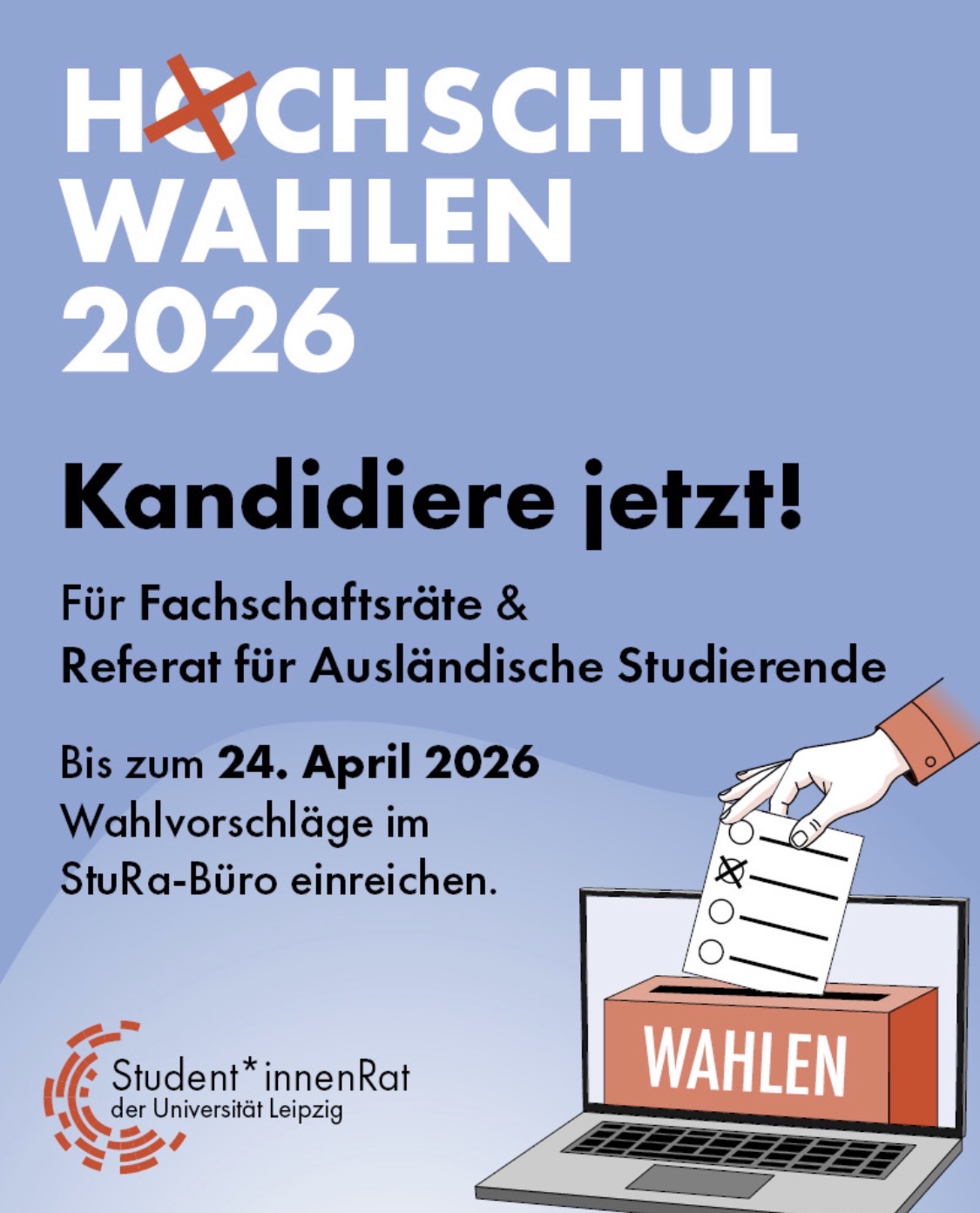 Dieses Jahr finden die Hochschulwahlen vom 16. bis zum 23. Juni 2026 statt. Und auch du kannst für deinen Fachschaftsrat oder auch das Referat für ausländische Studierender kandidieren!